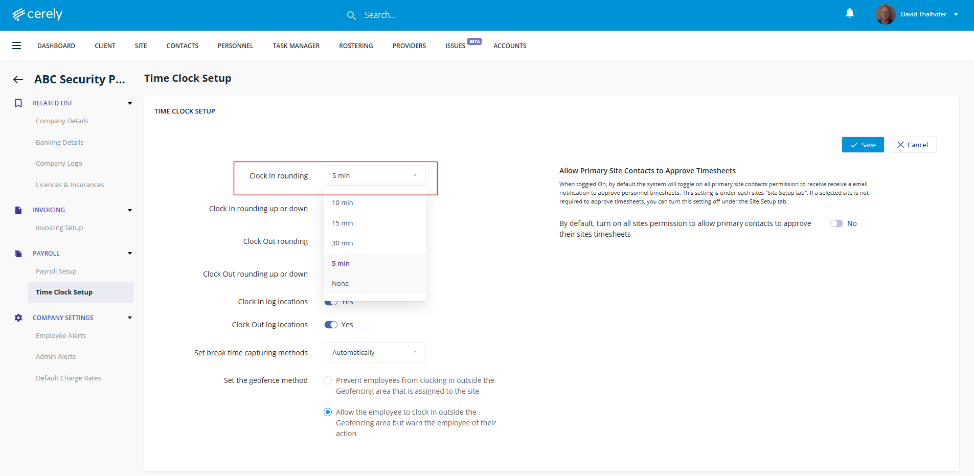 6. Choose your preferred clock in rounding options (from None up to 30 minutes). (This rounds the clock-in time based on your selection.)