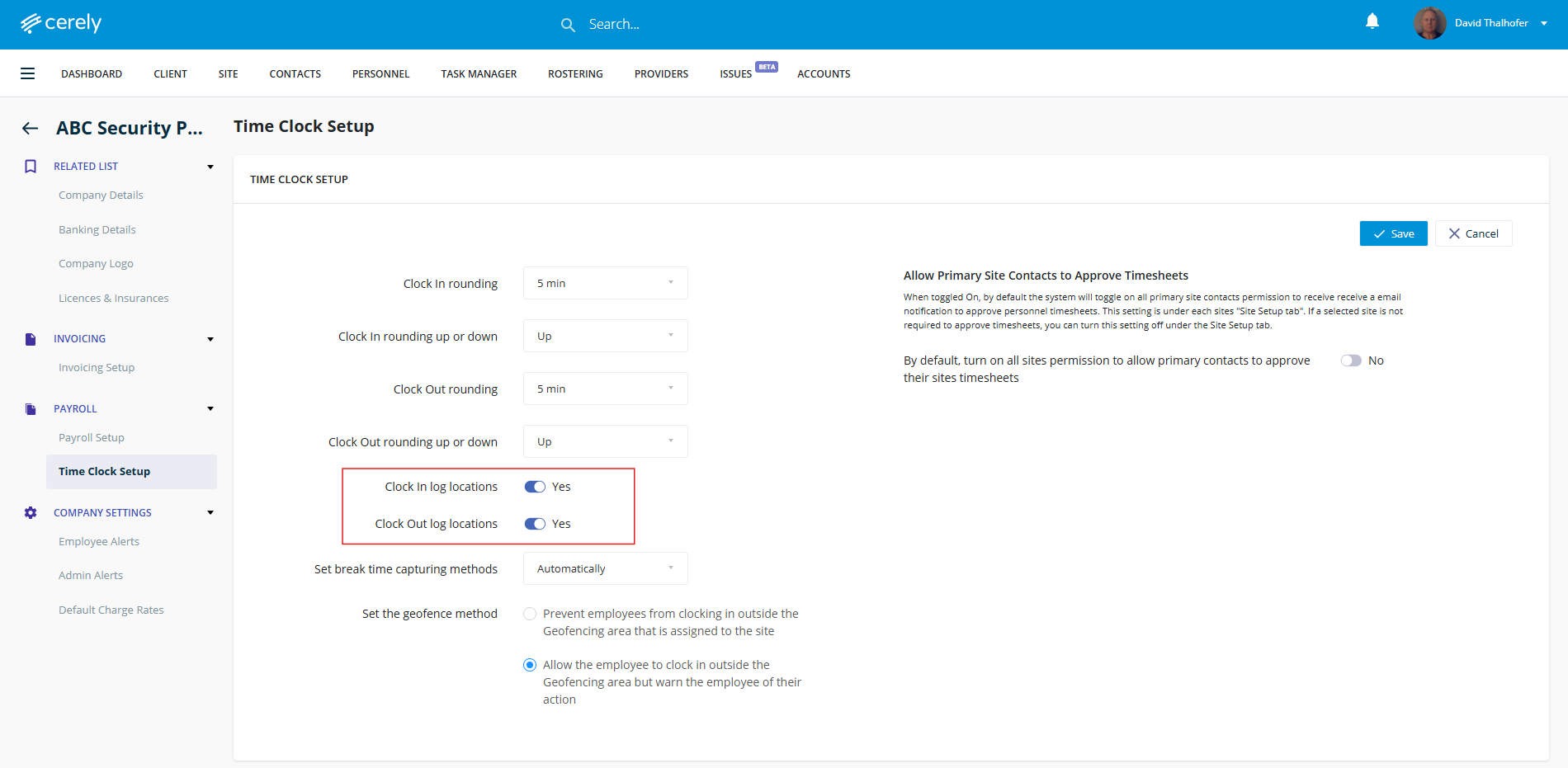 10. Select to turn on or off the clock in and out location tracking