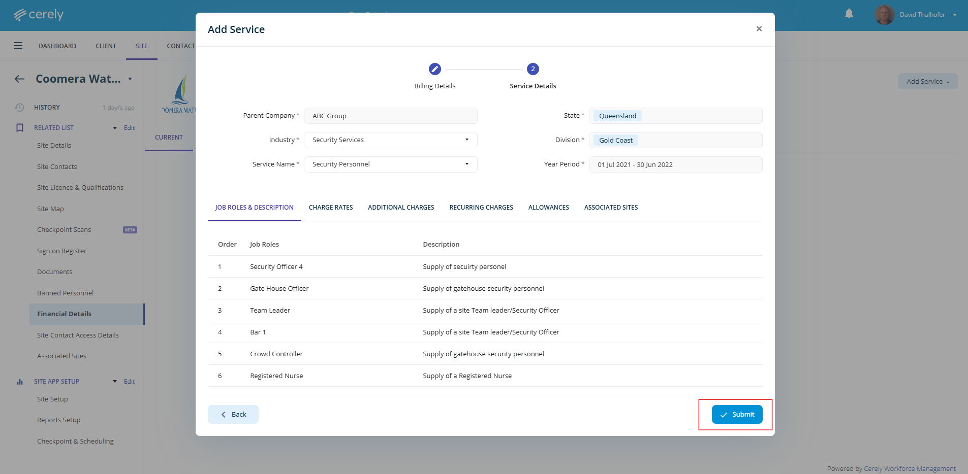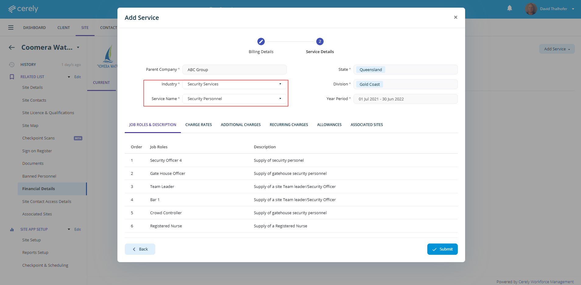 Note: Selecting the service name will automatically pull through the relevant Job Roles and associated Charge Rates