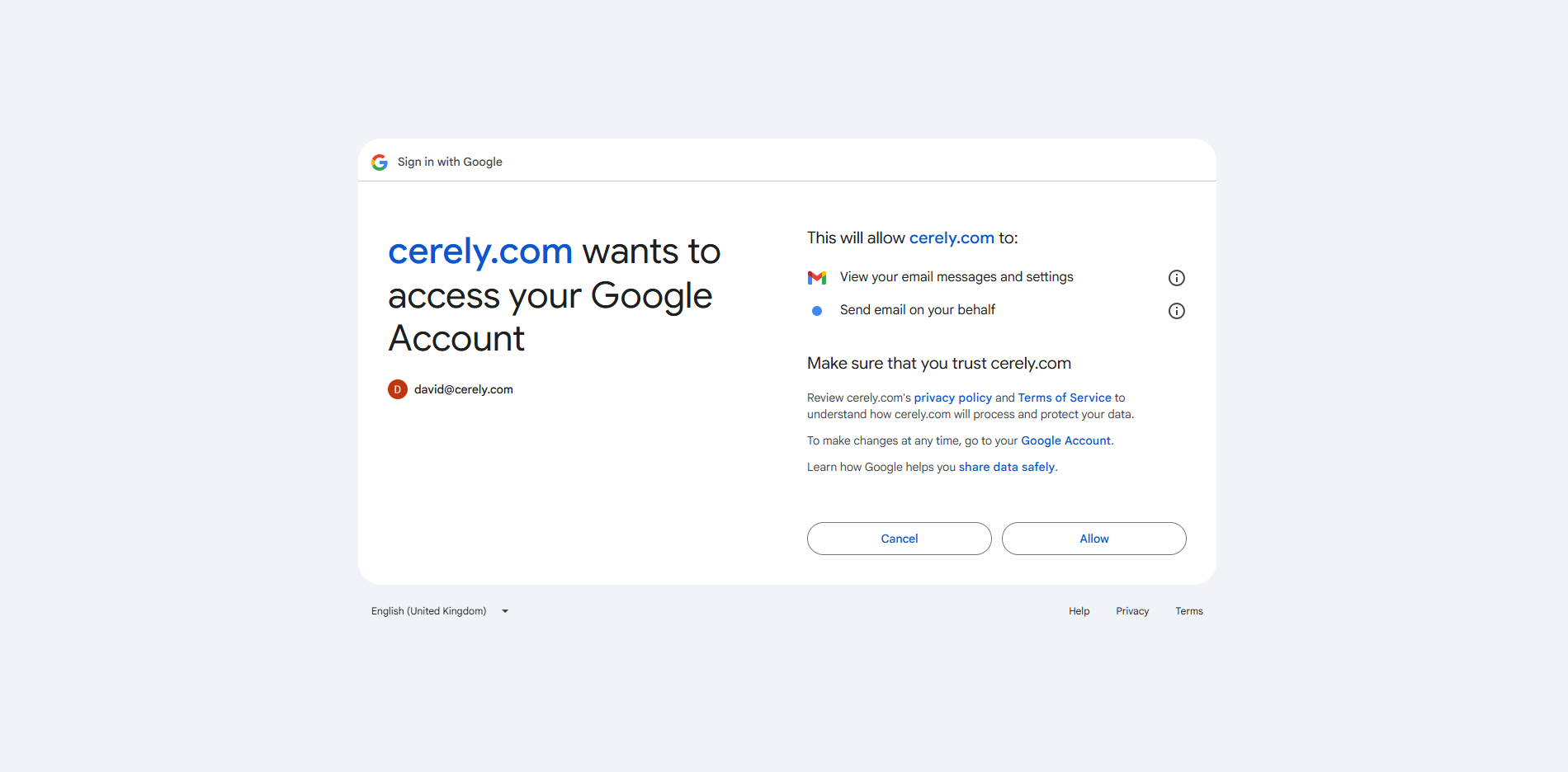 5. Enter the Google email address associated with your Cerely account—only the email used to log in to Cerely can be integrated.